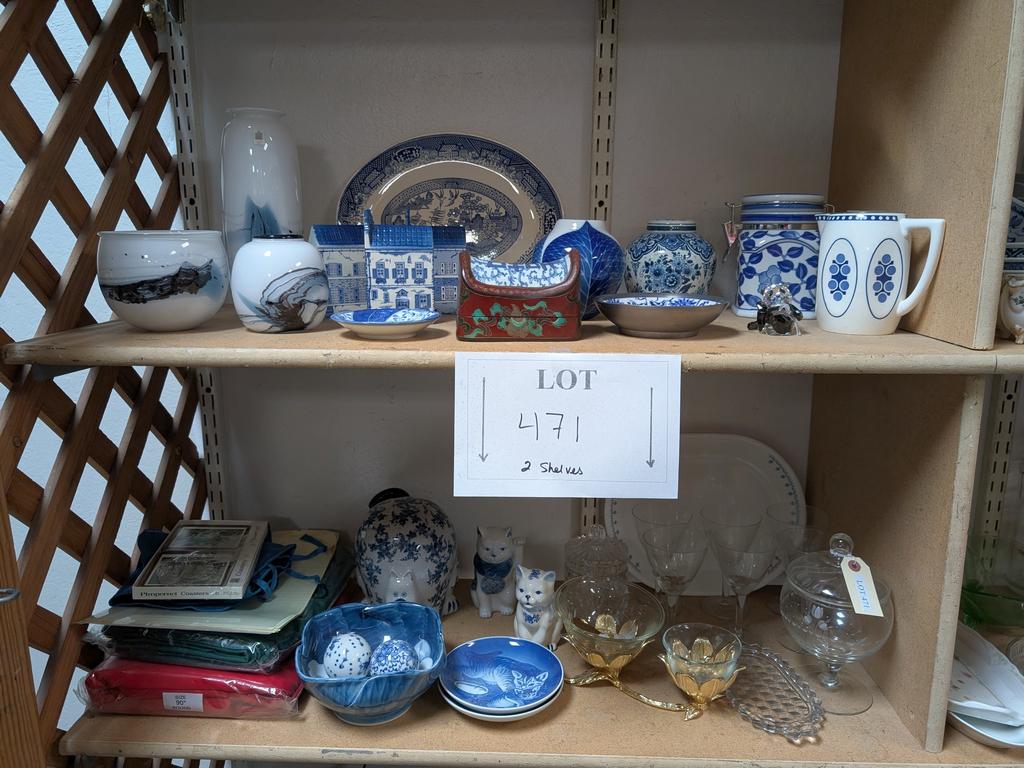 Lot 471: (2) Shelves Of Porcelain Decorative Items And Glassware
