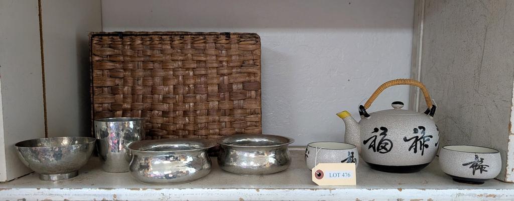 Lot 476: (4) Hand Hammered Pewter Dishes, China And Wicker Box.