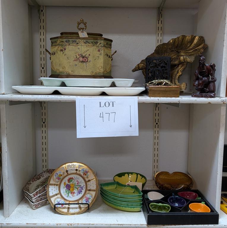 Lot 477: (2) Shelves Of Porcelain Serving Trays And Decorative Items.