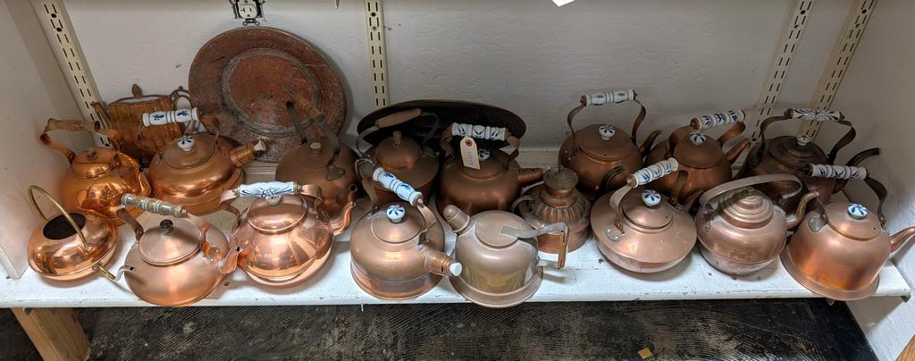 Lot 478: Large Shelf Of Copper Items, Mostly Kettles.