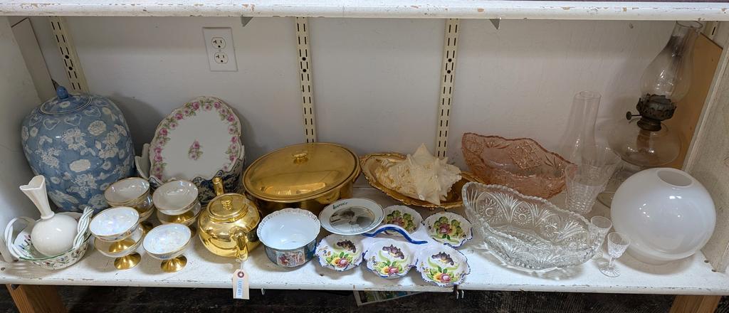 Lot 485: Shelf Of Household Items Incl. Goldware Oil Lamp, Serving Dishes.