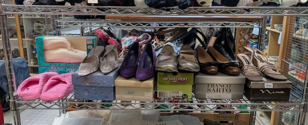 Lot 498: Shelf Of Ladies' Shoes And Slippers.