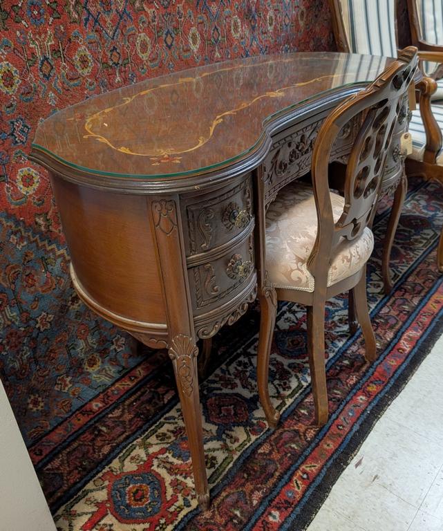Lot 513: Provincial Style Marquetry Inlay Kidney Shaped Desk With Chair.