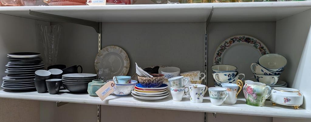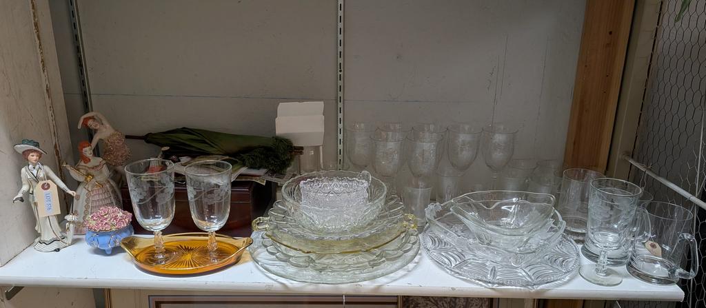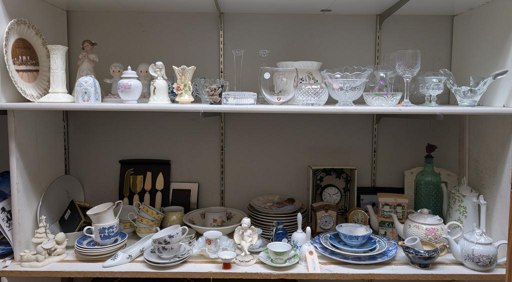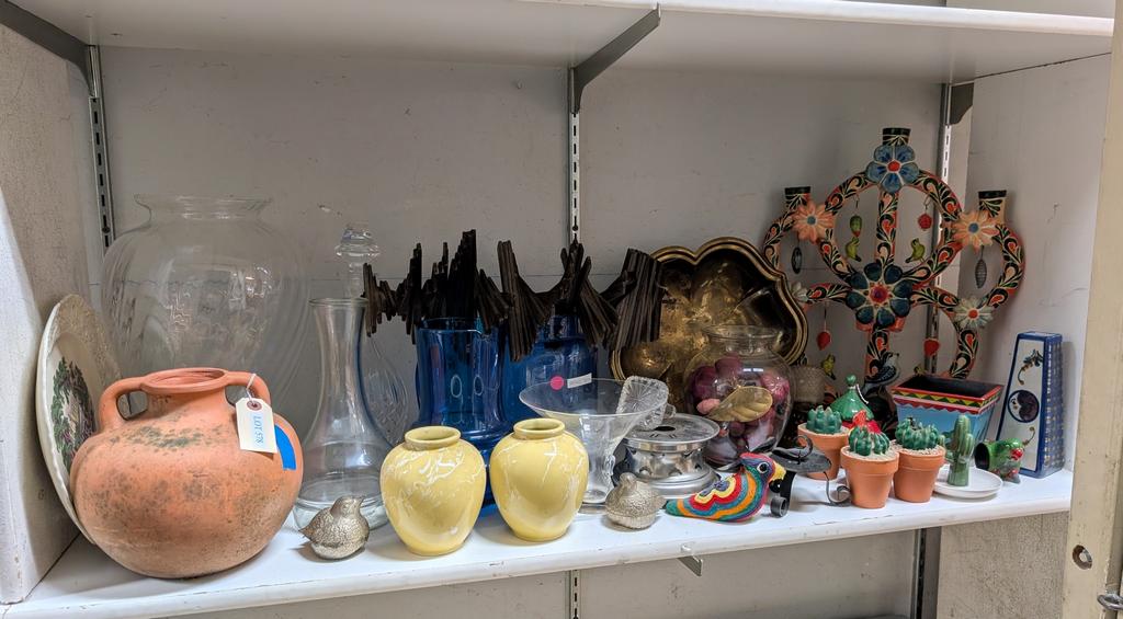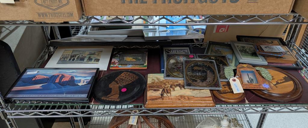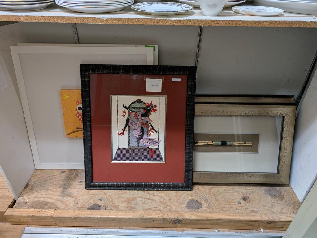 Lot 560: Shelf Of Small Framed Art And Knick Knacks.