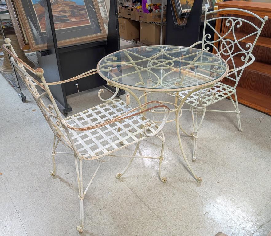 Lot 566: Painted Metal Glass Top Patio Ice Cream Table & 2 Chairs.