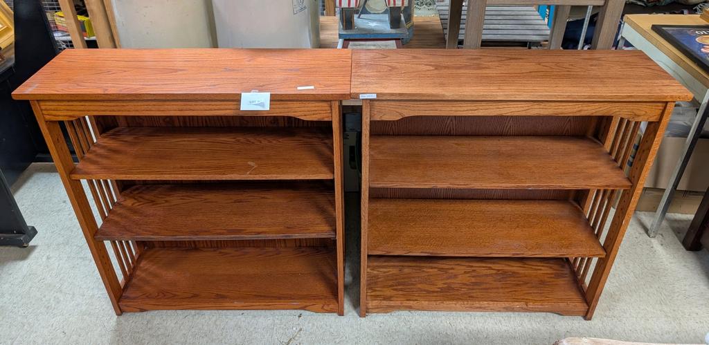 Lot 567: Pair Of Mission Style Oak 3-Shelf Bookcases.