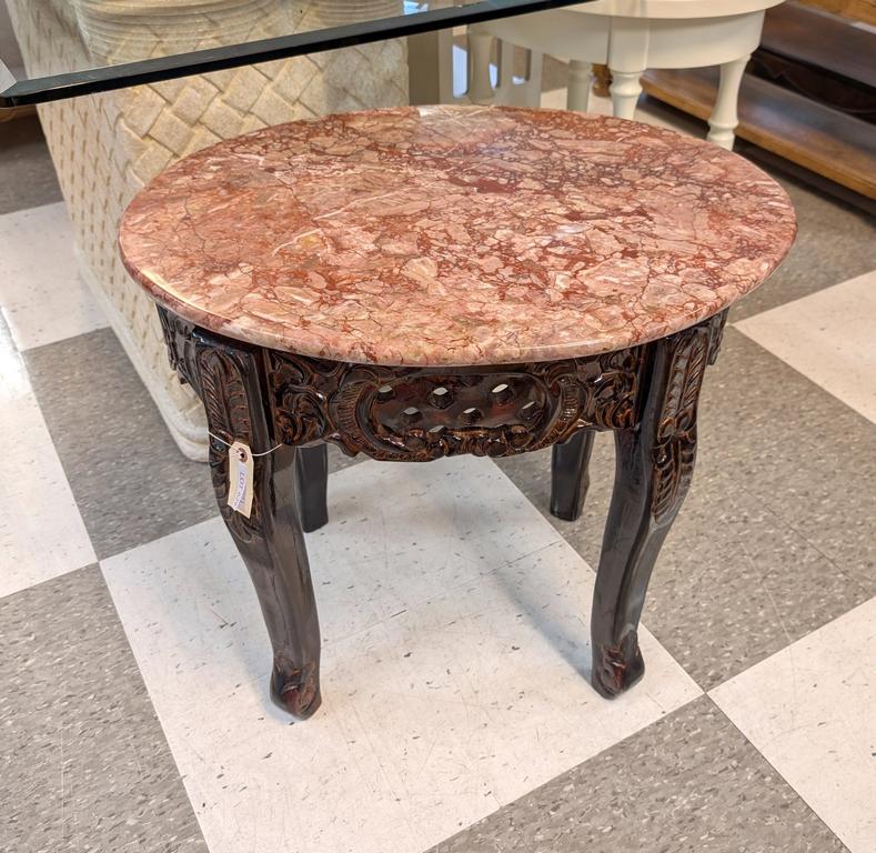 Lot 629: Carved Oval Occasional Table With Rouge Marble Top.