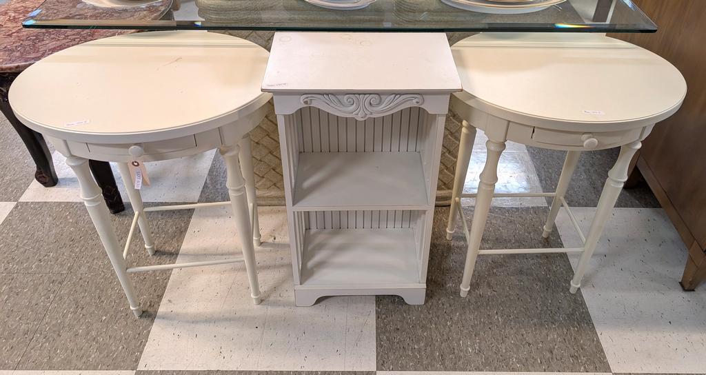 Lot 630: (2) Oval White Side Tables And Small Bookshelf.