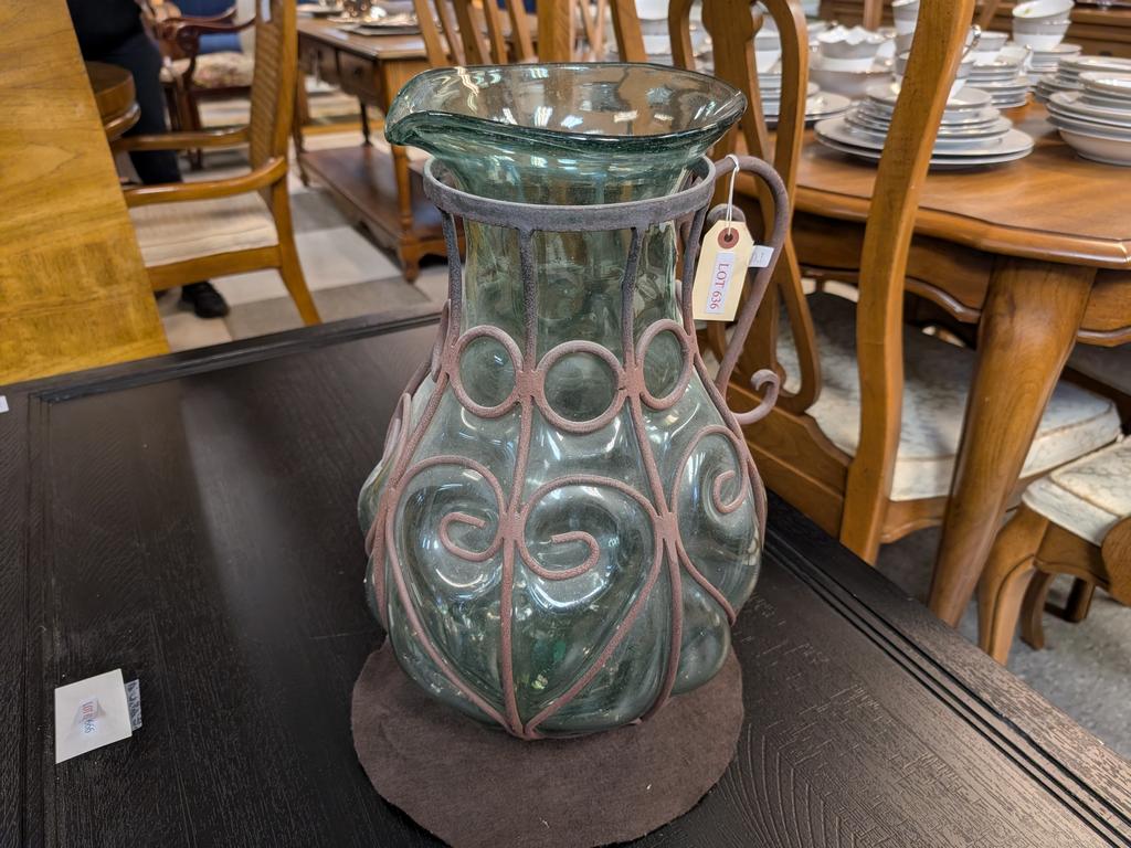 Lot 636: Hand Blown Green Glass Pitcher In Metal Case.