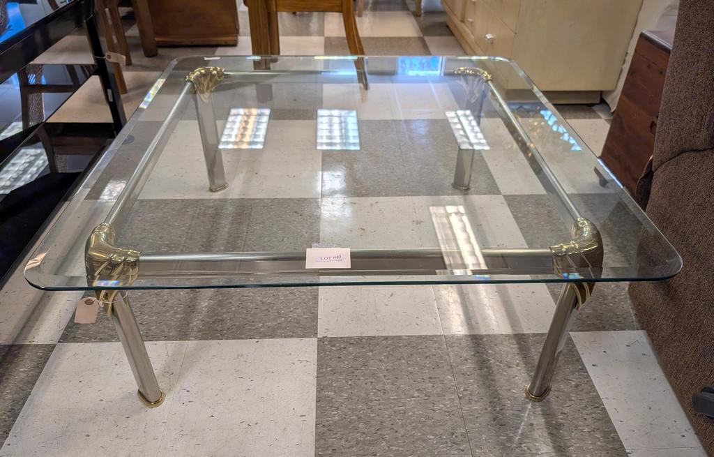 Lot 640: Square Glass Top Coffee Table On Metal Base.