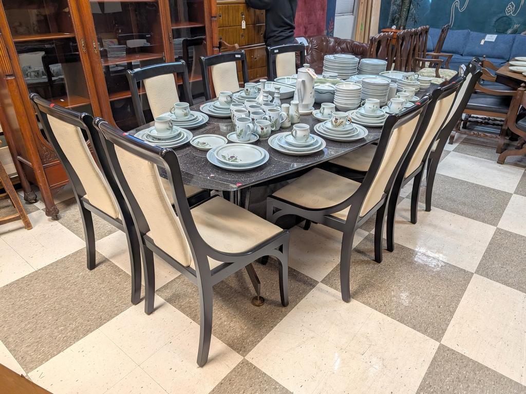Lot 649: Black Granite Top Pedestal Dining Table And 8 Chairs.
