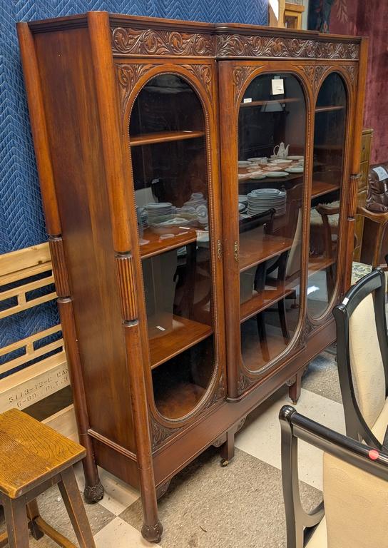 Lot 651: Carved Mahogany Triple Glass Front Door 10-Shelf Bookcase On Casters.
