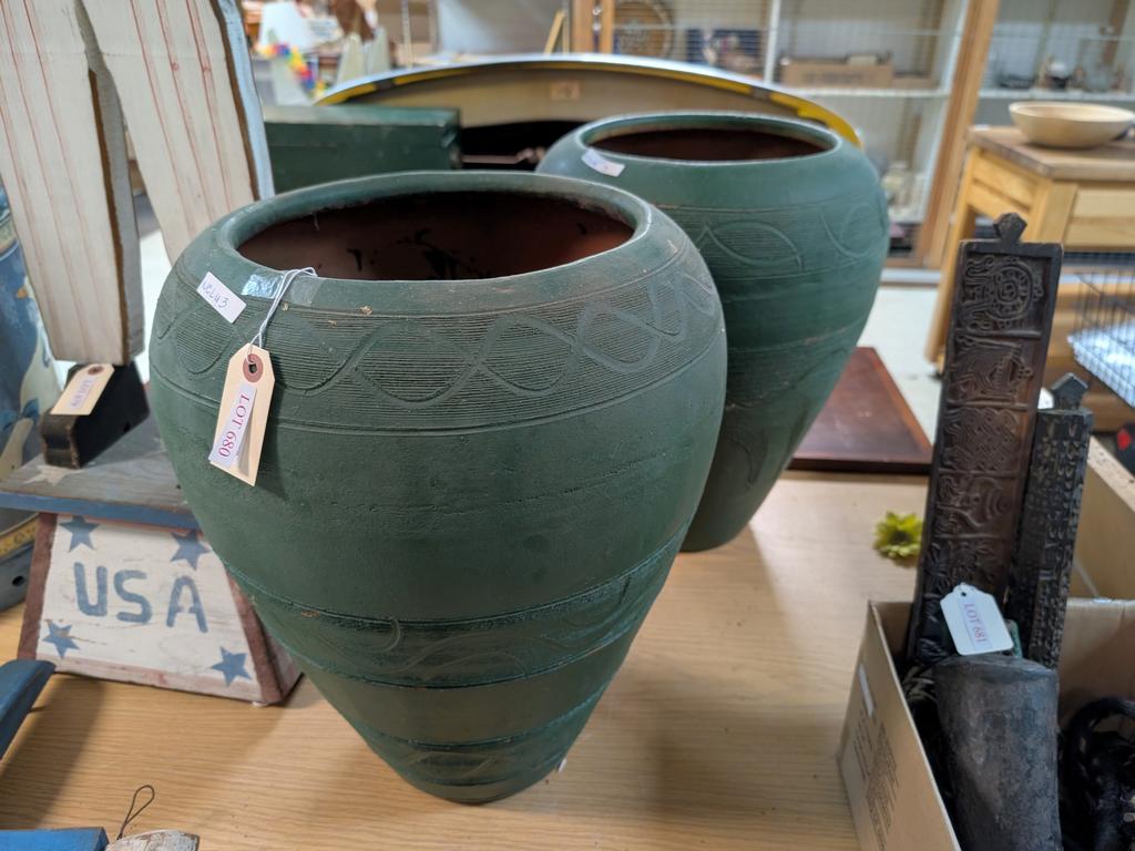 Lot 680: (2) Mexico Green Glazed Planter Vases With Faux Flowers.