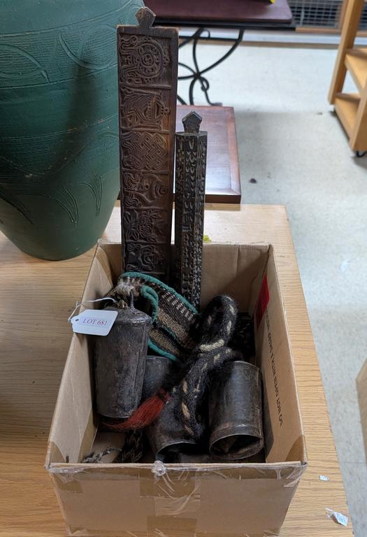 Lot 681: Box Of Cowbells And 2 Asian Ink Sticks.