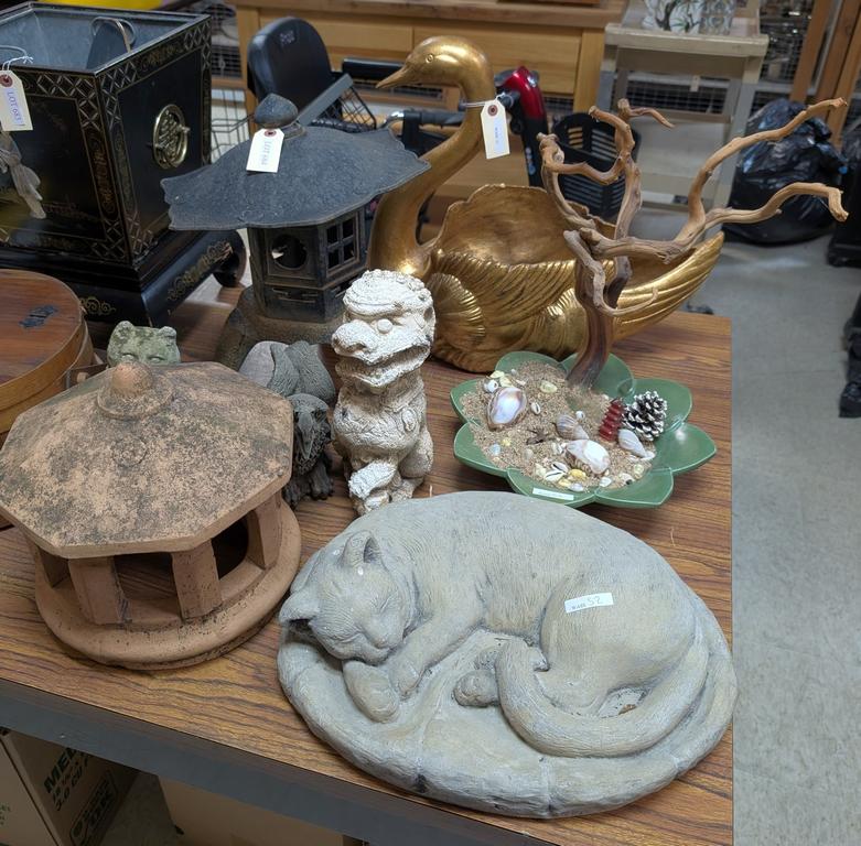 Lot 684: Group Of Stone Garden And Indoor Decorations Incl. Pagoda, Gilt Swan.