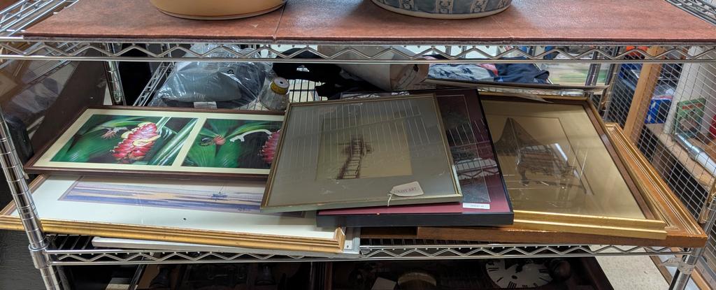 Lot 687: Shelf Of Artwork And Prints Incl. Judy Knowles Watercolor.