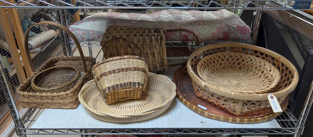 Lot 696: Shelf Of Hand Woven Baskets And A Copper Tray.