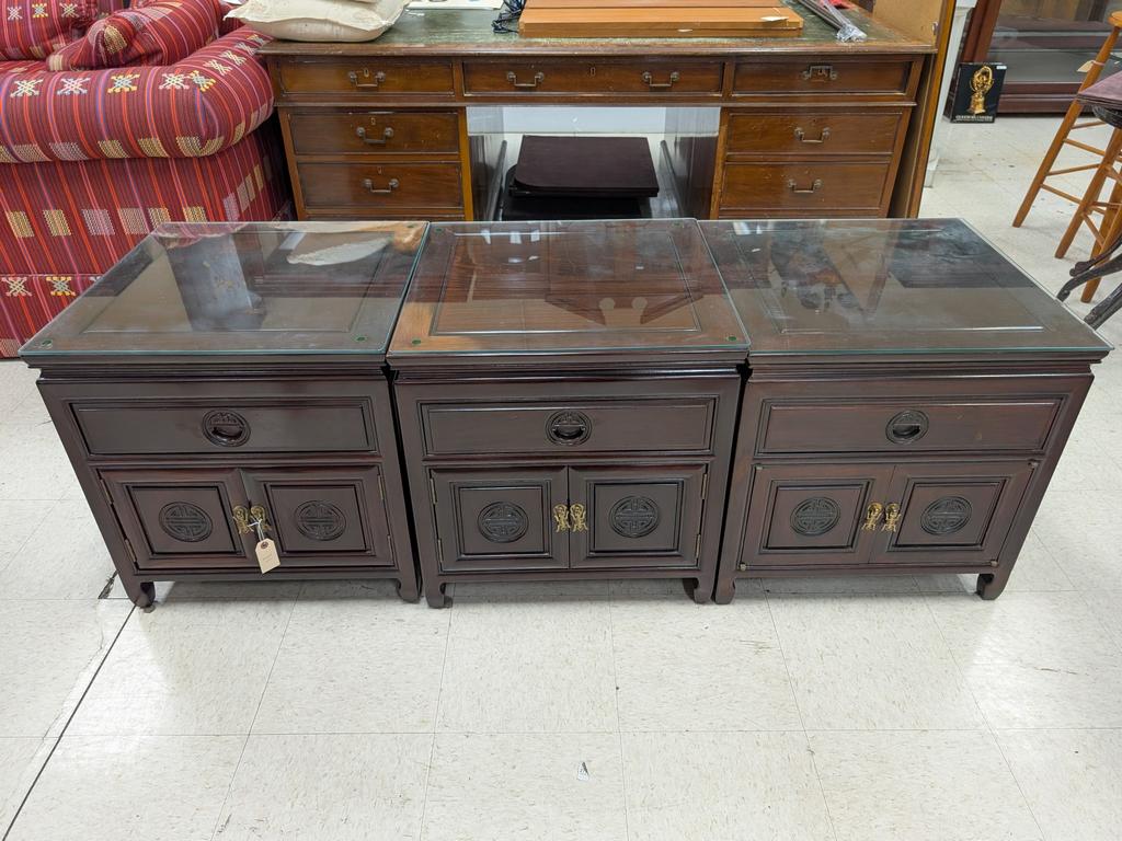 Lot 718: (3) Oriental Single Drawer, 2-Door Side Tables.