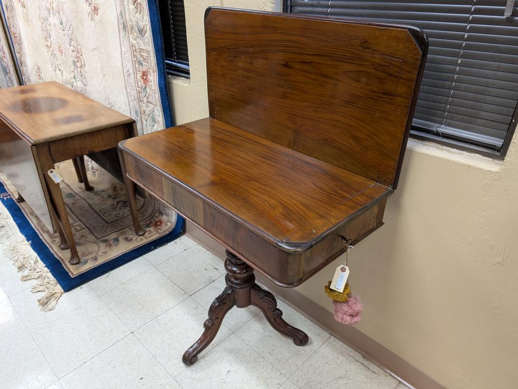Lot 724: 19th C. Mahogany Fold Over Table With Single Drawer.