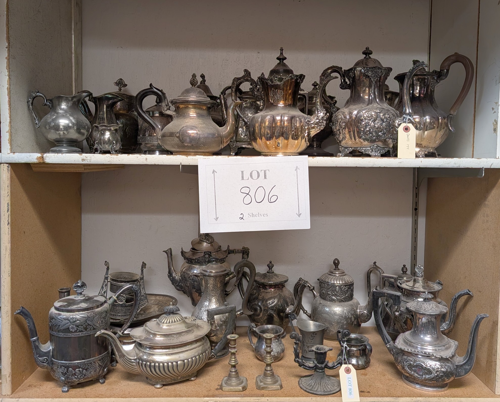 Lot 806: (2) Shelves Of Silver Plated Coffee Pots & Candle Holders.