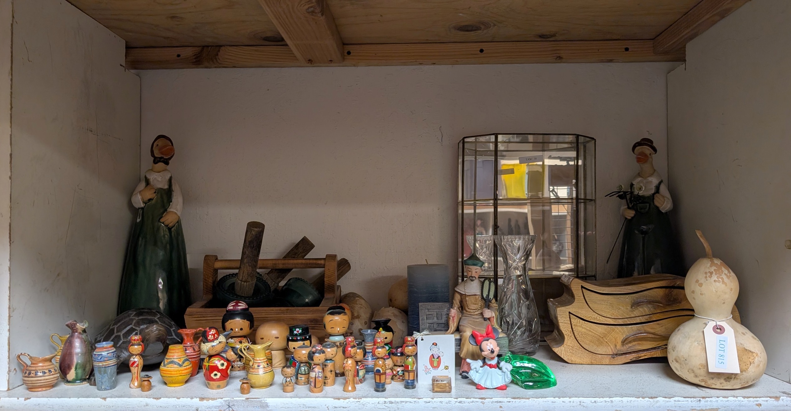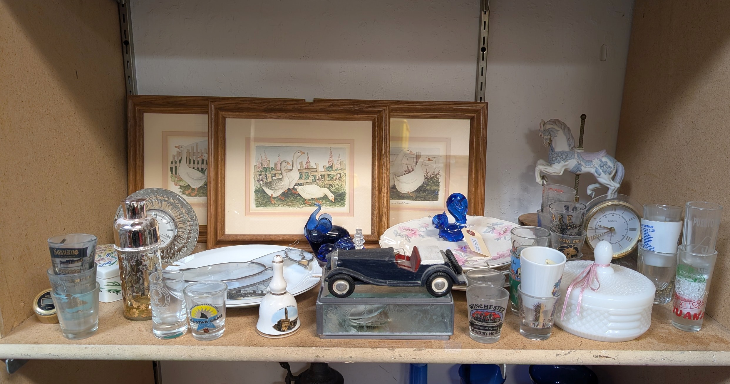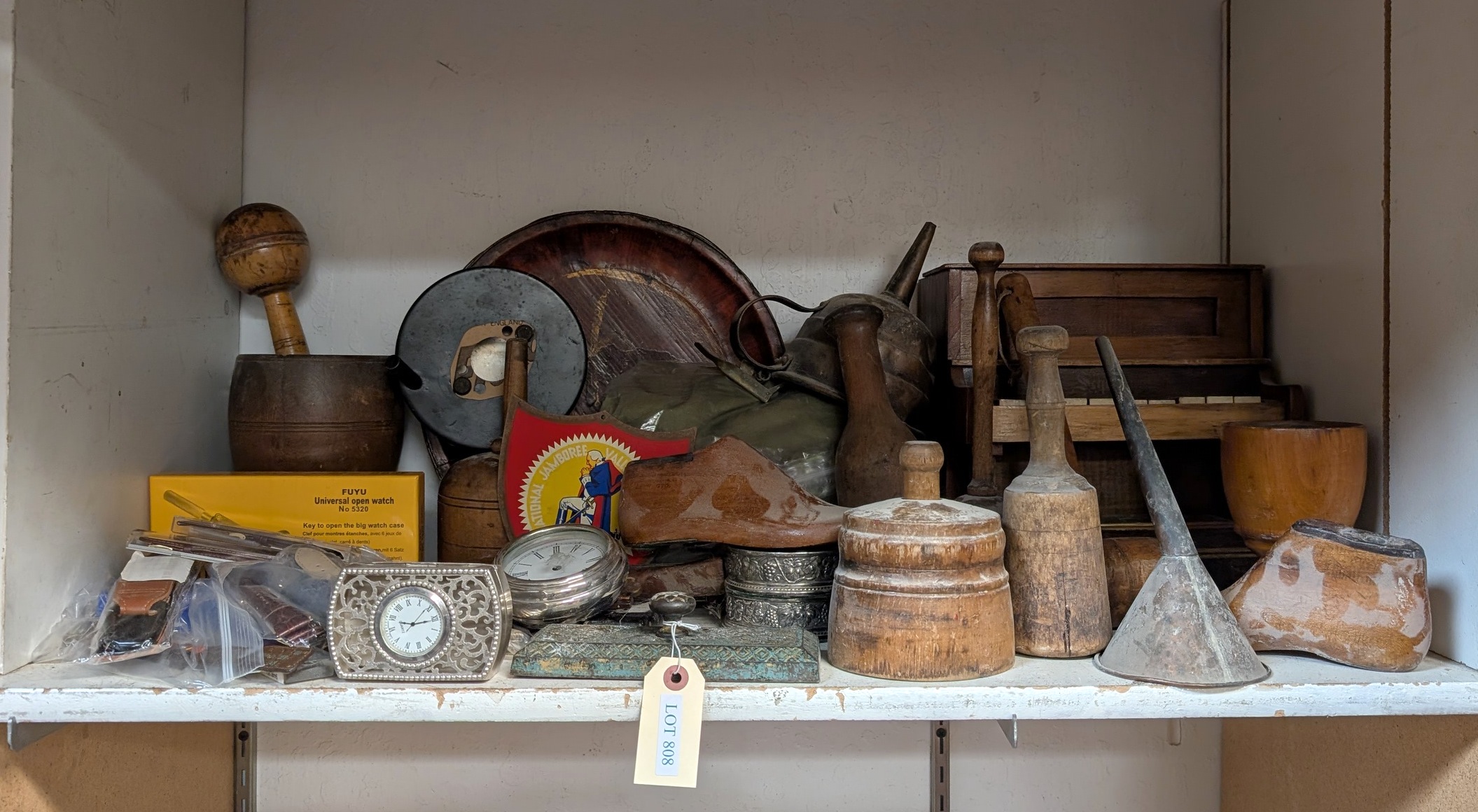 Lot 808: (2) Shelves Of Collectibles Incl. Clocks, Shoe Forms.