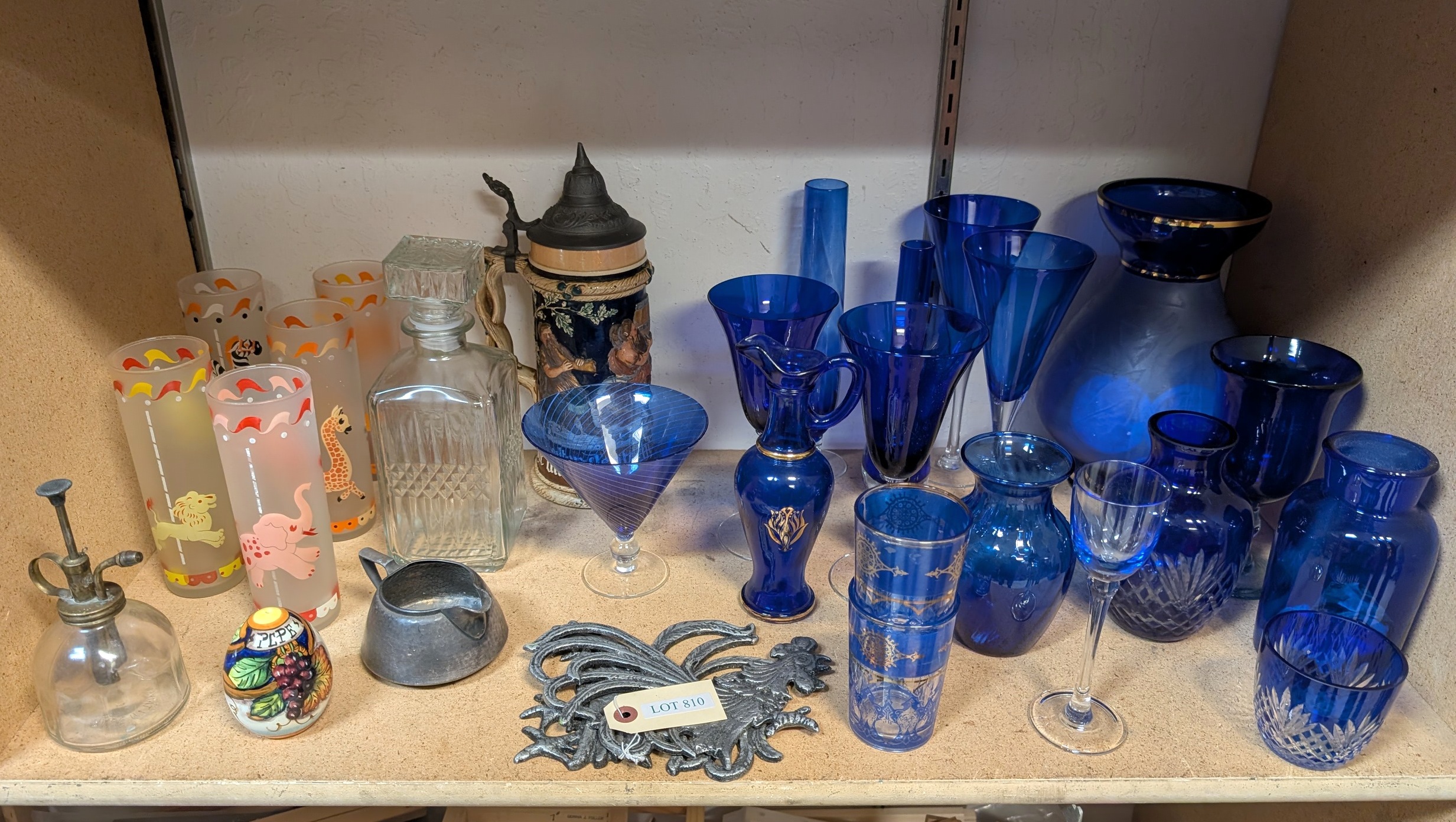 Lot 810: Shelf Of Glassware Incl. Blue Glass Stemware.