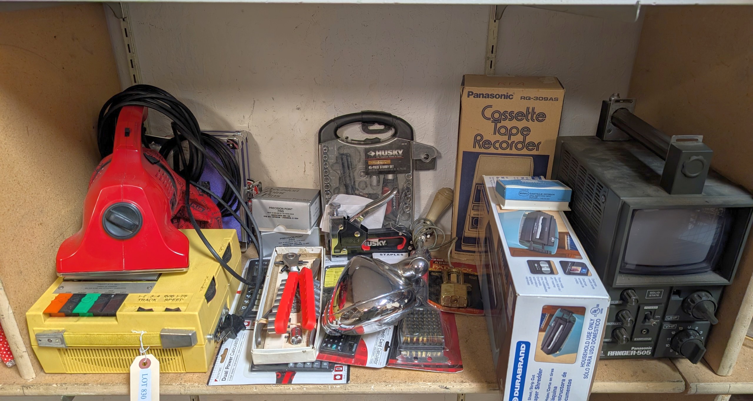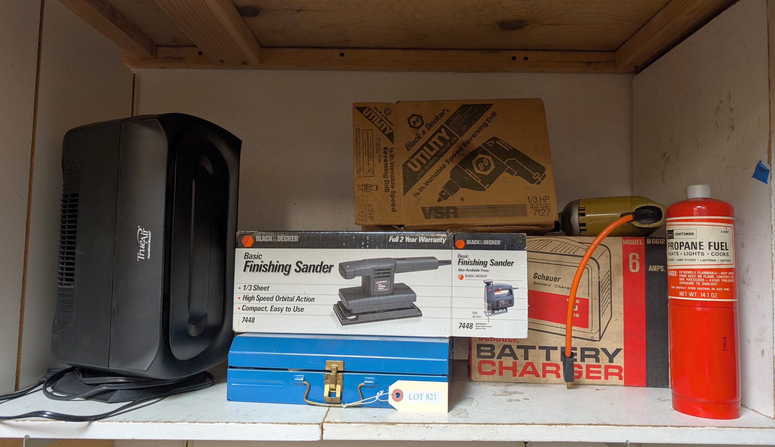 Lot 821: Shelf Of Tools Incl. Torch, Battery Charger, Air Purifier.