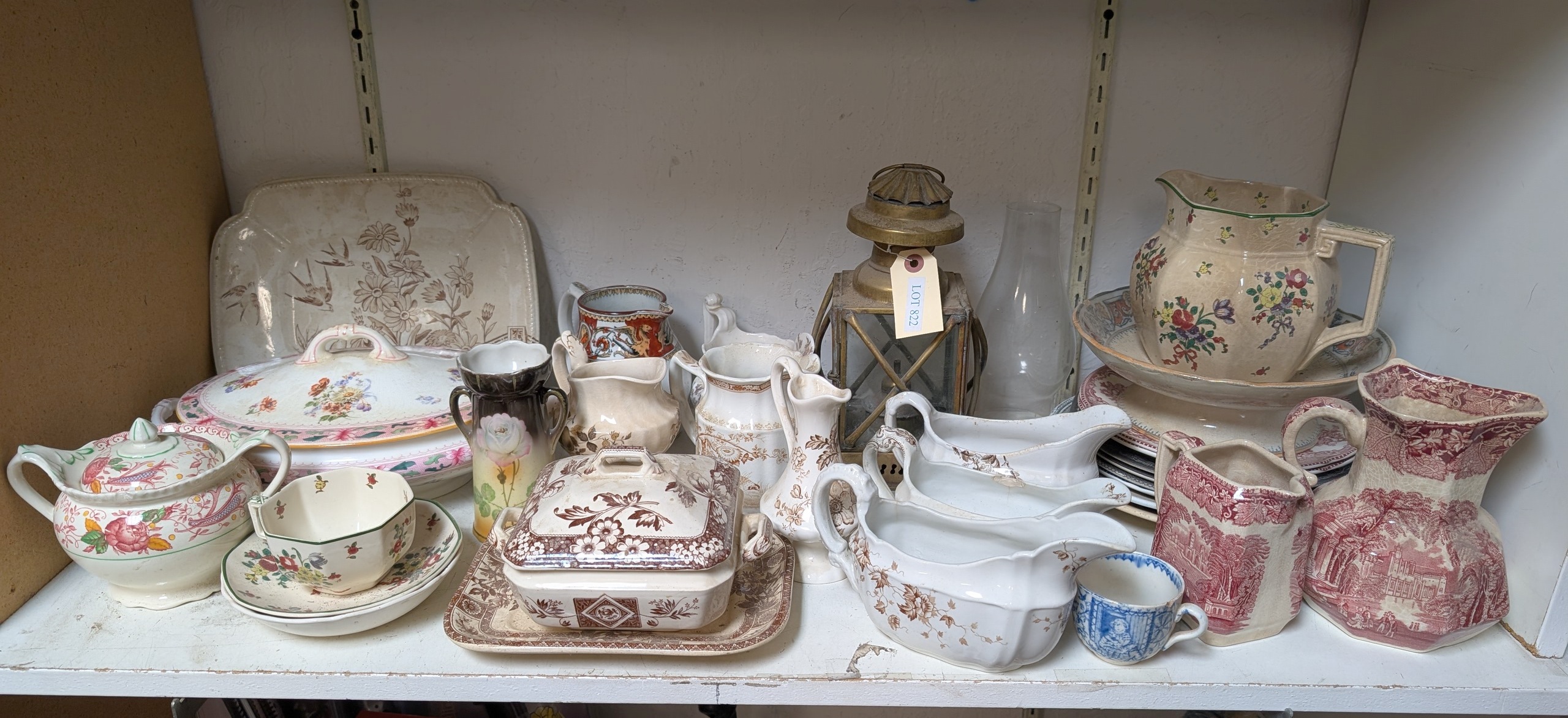 Lot 822: Shelf Of Dishware Incl. Gravy Boats, Pitchers.
