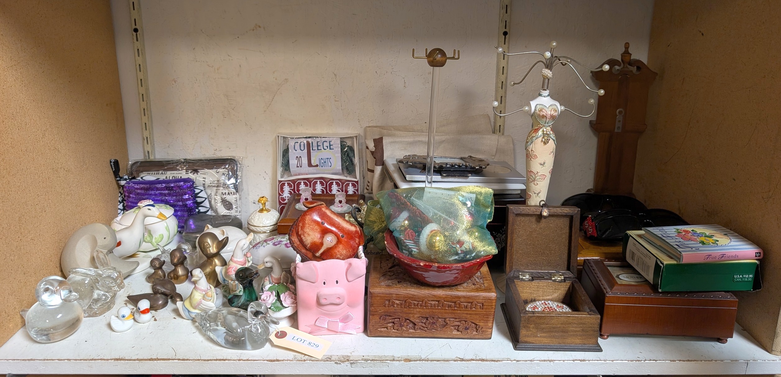 Lot 809: Shelf Of Decorative Items Incl Milk Glass, Animal Figures.