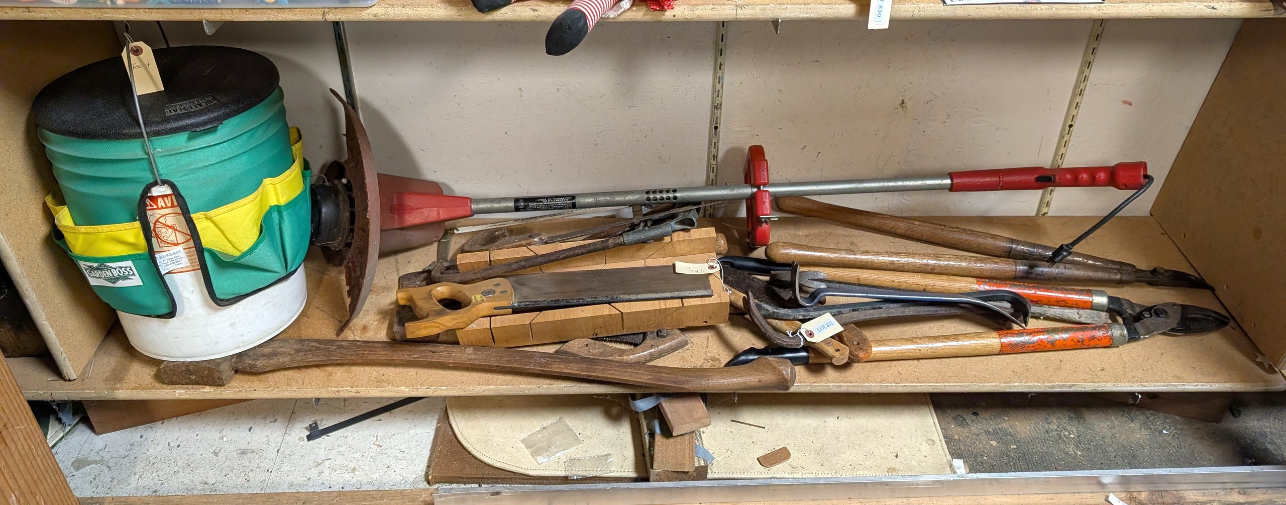 Lot 832: Shelf Of Long Handled Tools And A Trimmer.