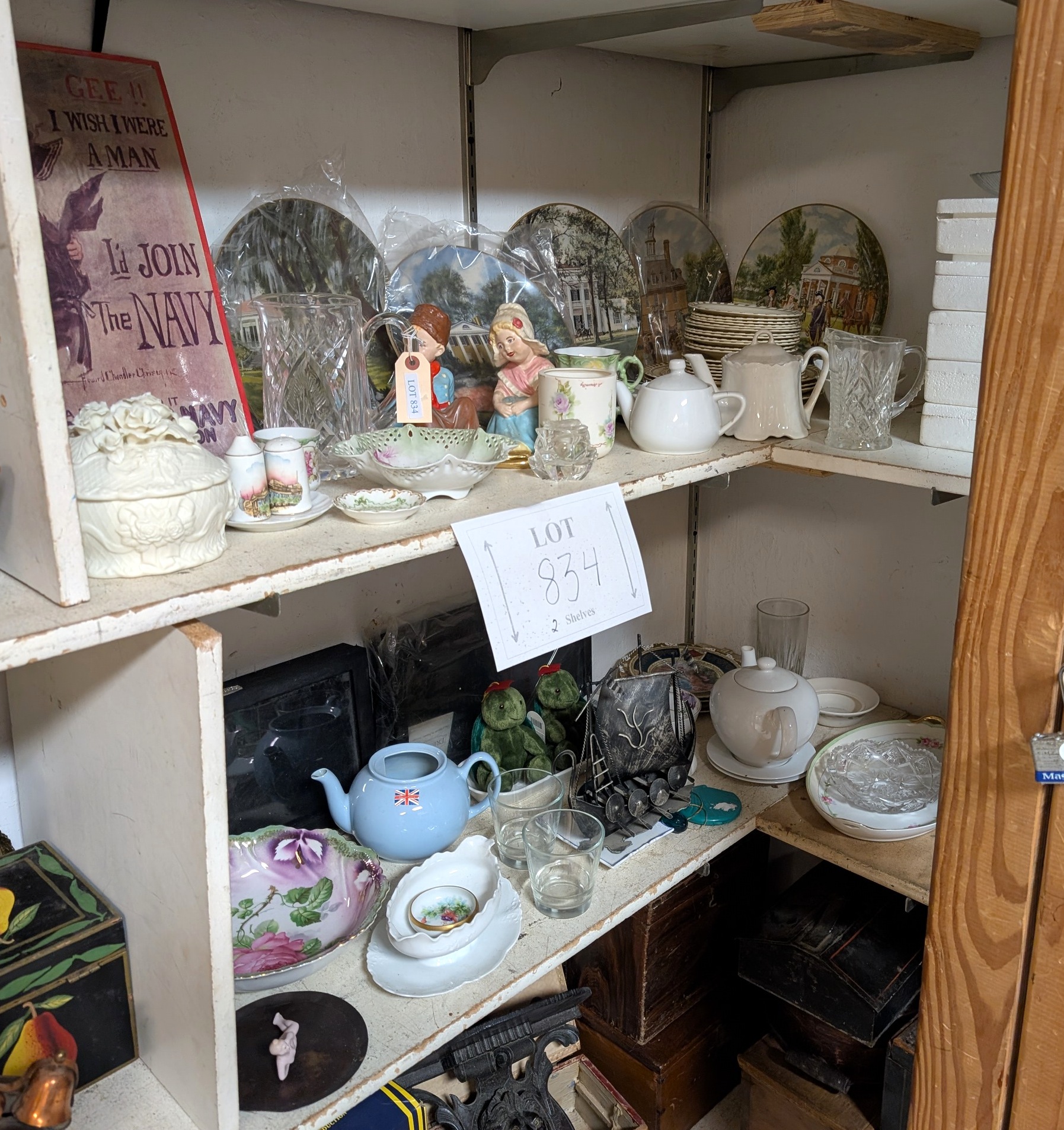 Lot 834: (2) Shelves Of Porcelain Items Incl. Figurines, Teapots, Pitchers.
