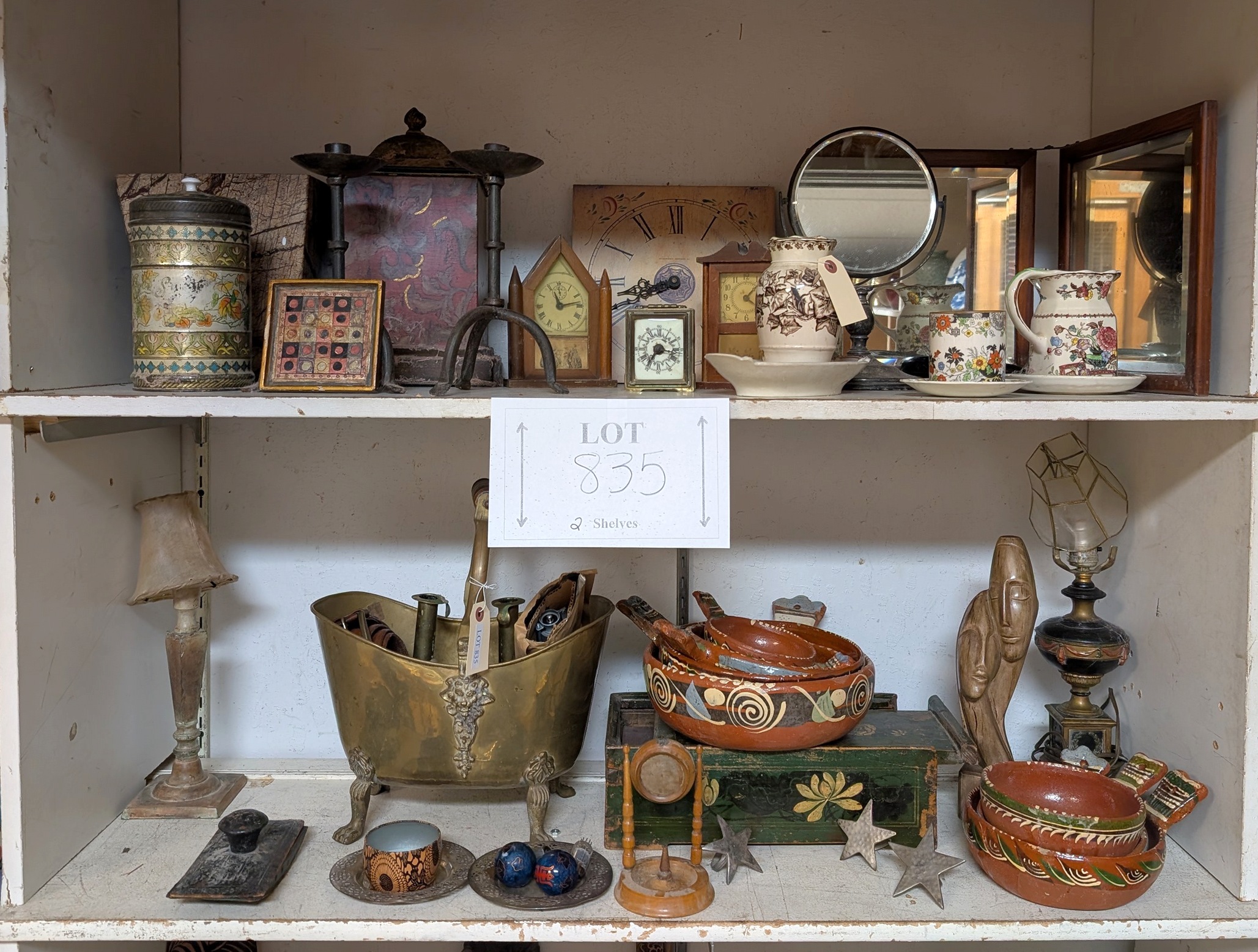 Lot 835: (2) Shelves Of Decorative Items Incl. Clocks.