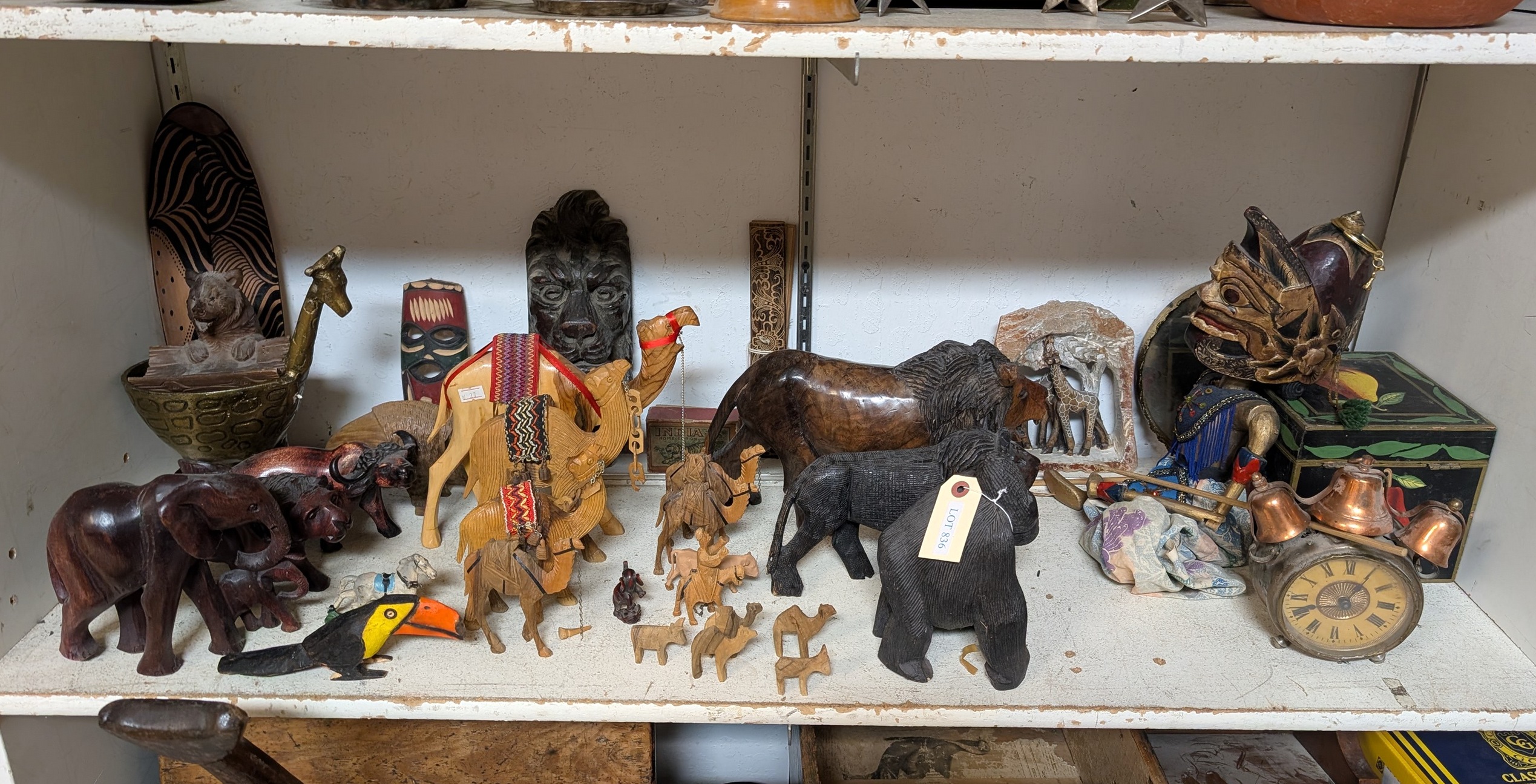 Lot 836: Shelf Of Decorative Items Incl Carved Wood Animals.