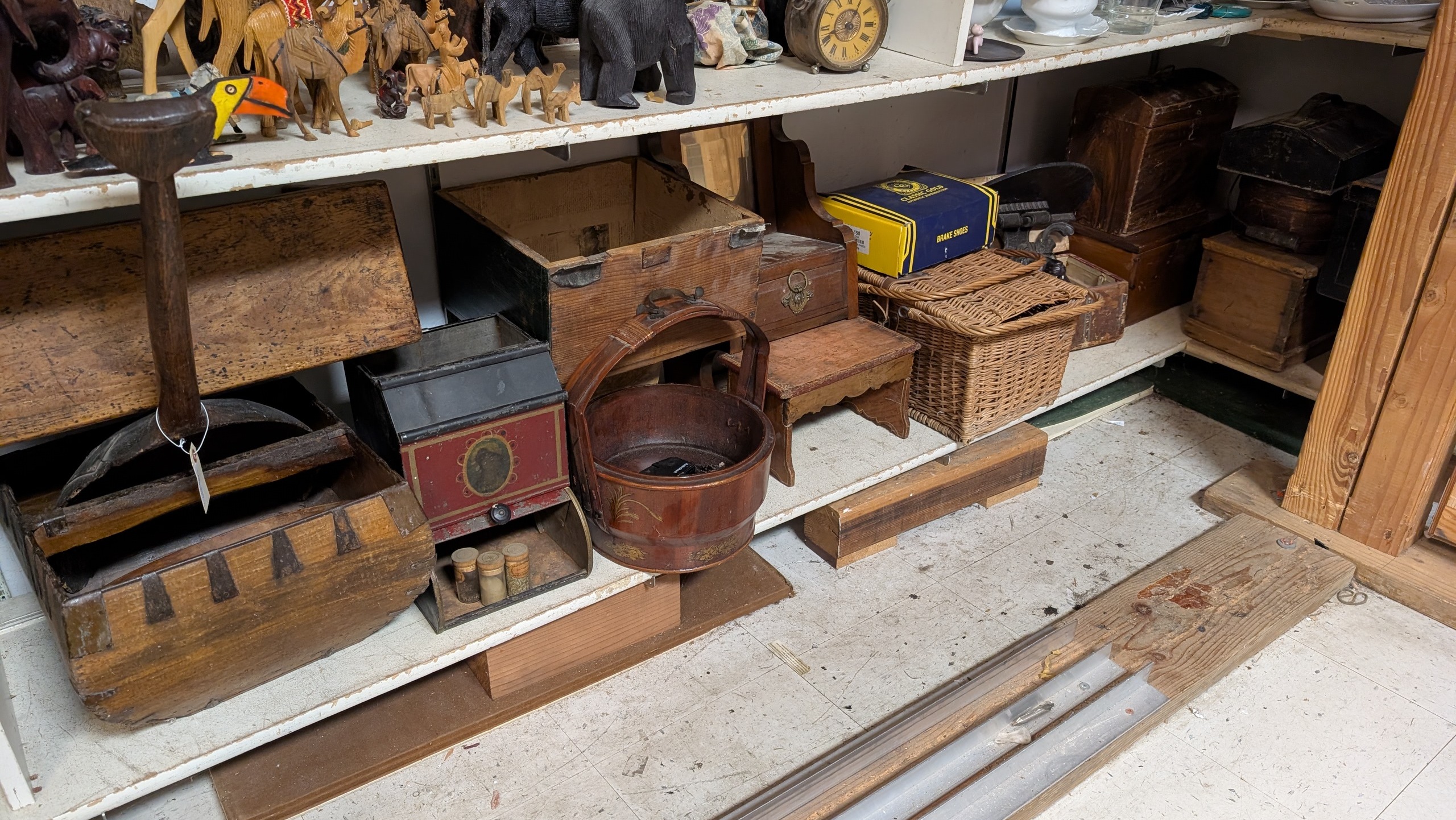 Lot 837: Large Shelf Of Boxes, Baskets And Barrel.