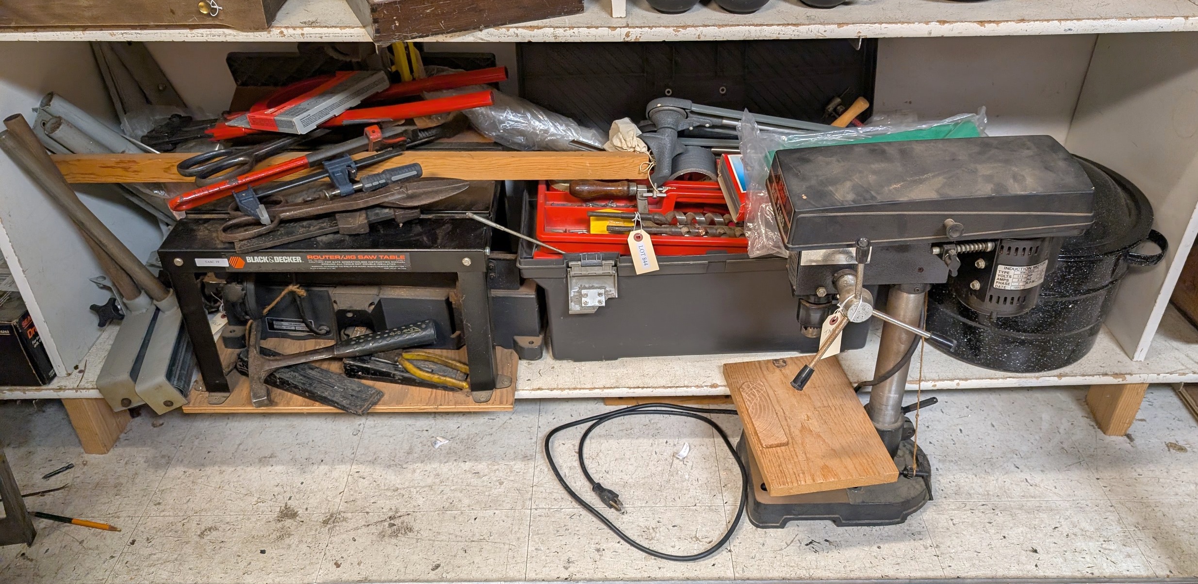 Lot 844: Large Shelf Of Tools And A Drill Press.