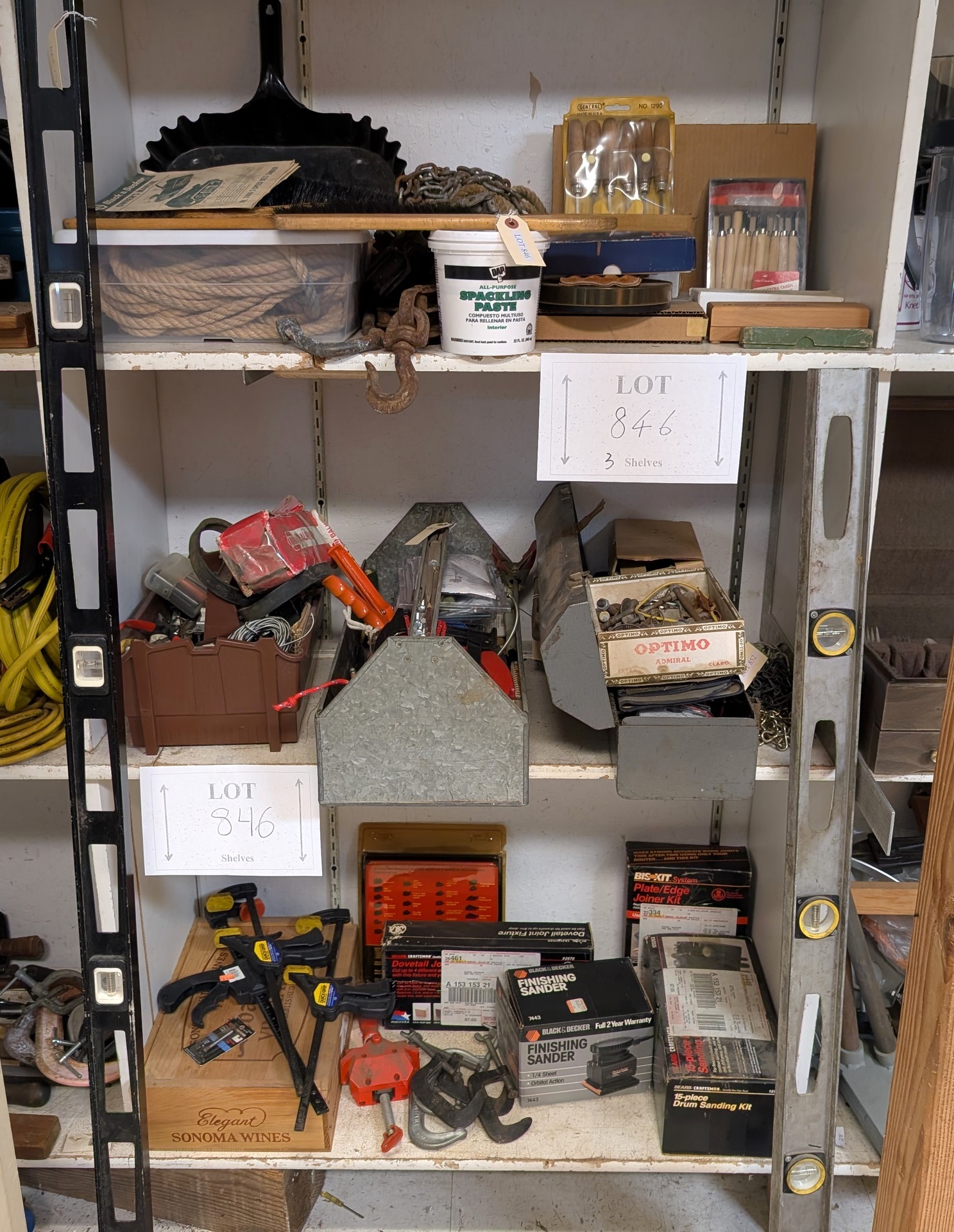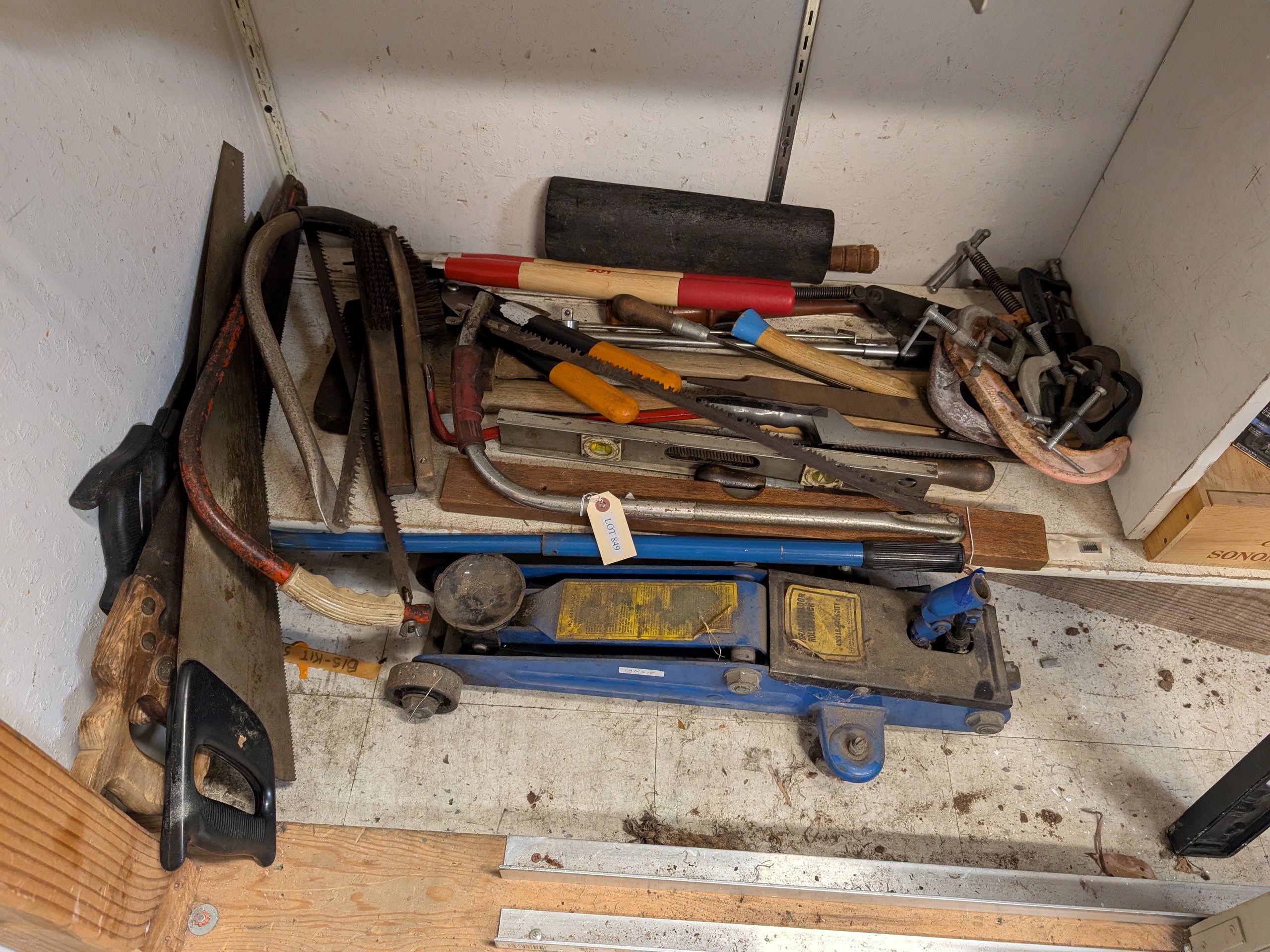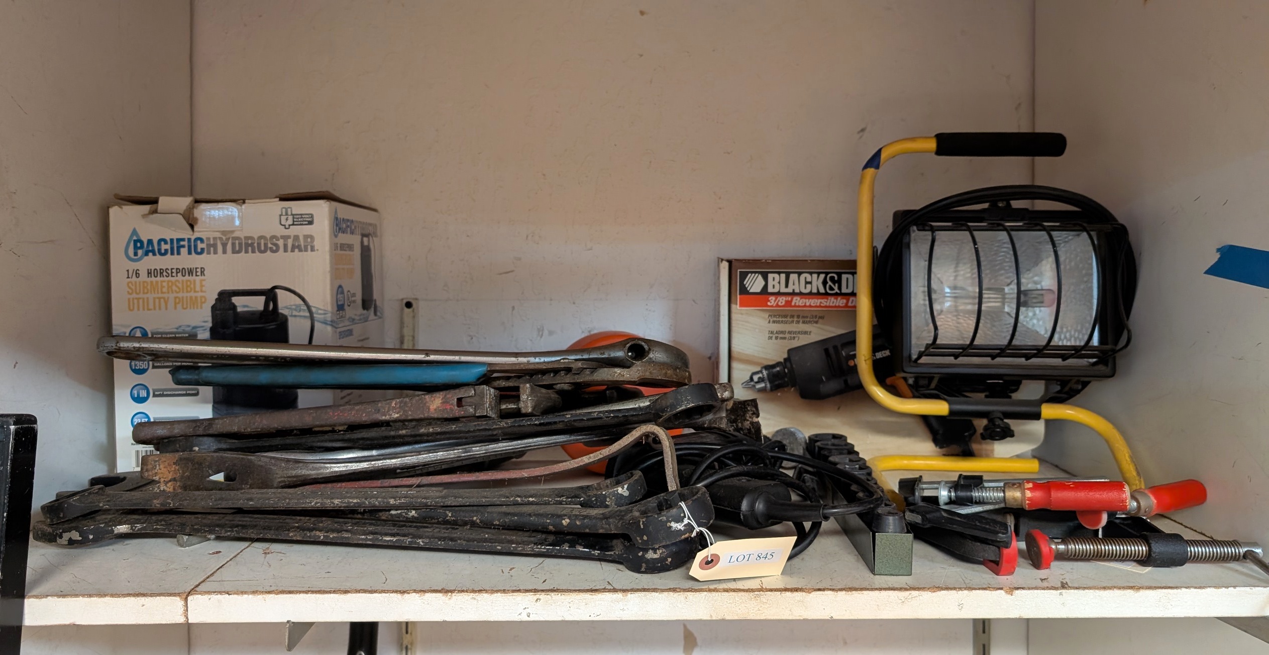 Lot 845: Shelf Of Hand Tools And Work Light.