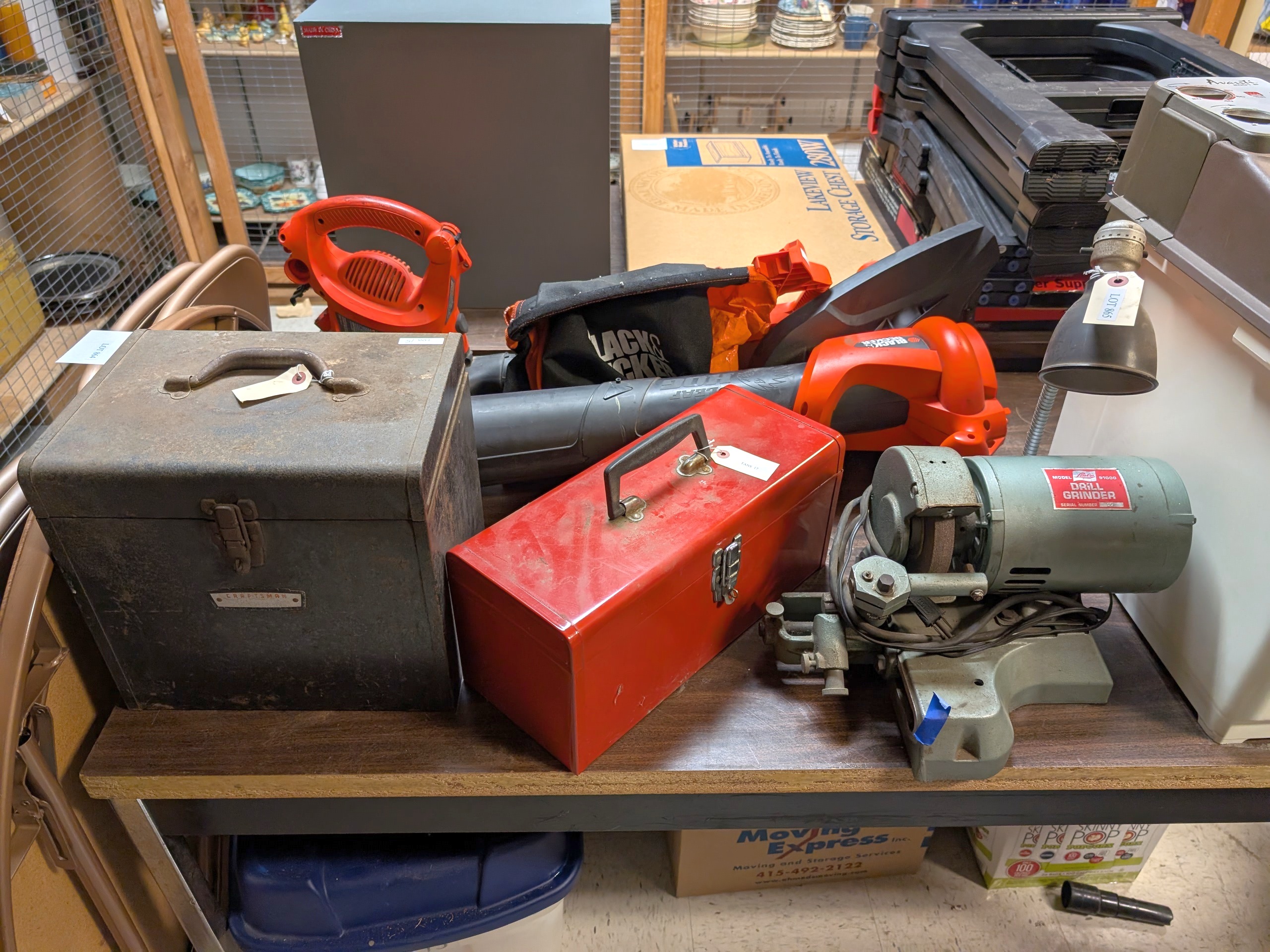 Lot 865: Group Of Tools Incl. Grinder, Hand Saw, Tool Box With Tools.