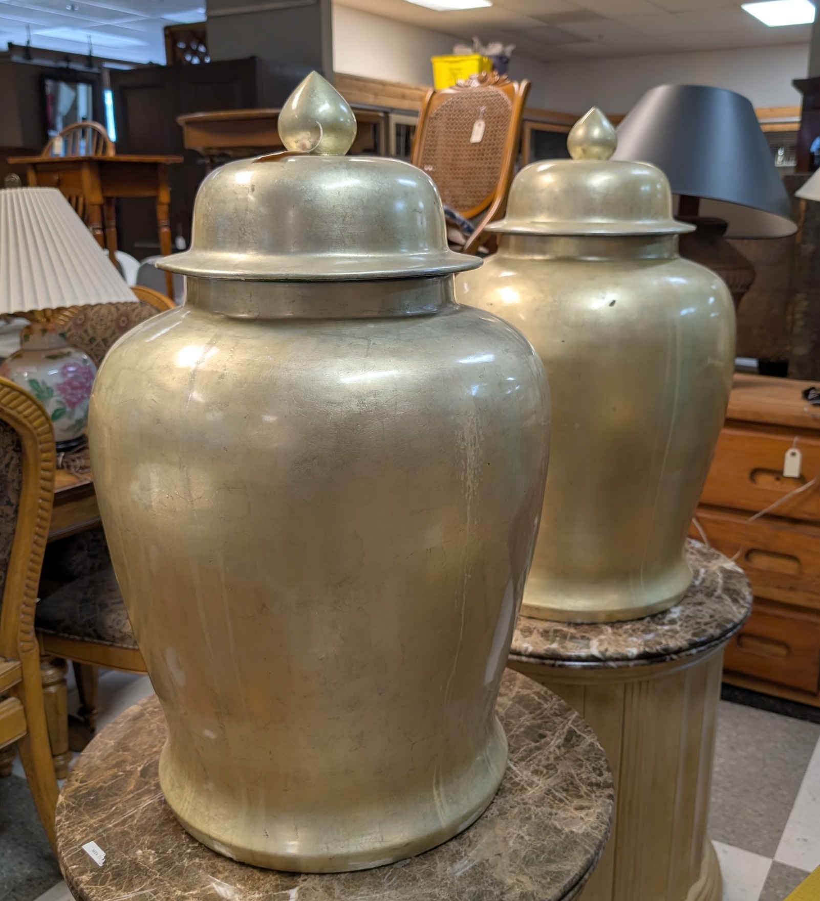 Lot 891: Pair Of Large Porcelain Gilt Painted Lidded Urns. 32" X 18"