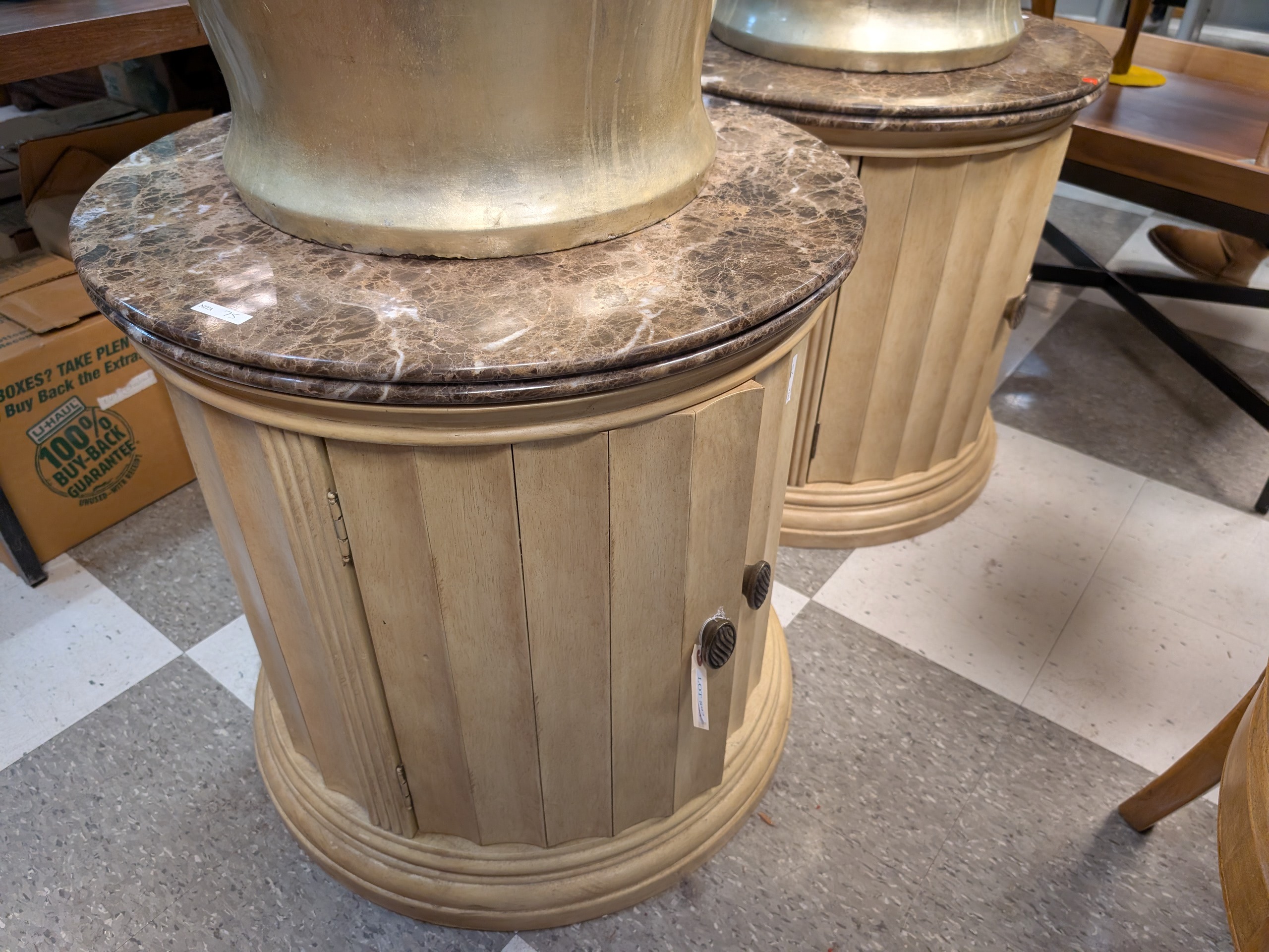 Lot 892: (2) Marble Top Cylindrical End Tables.